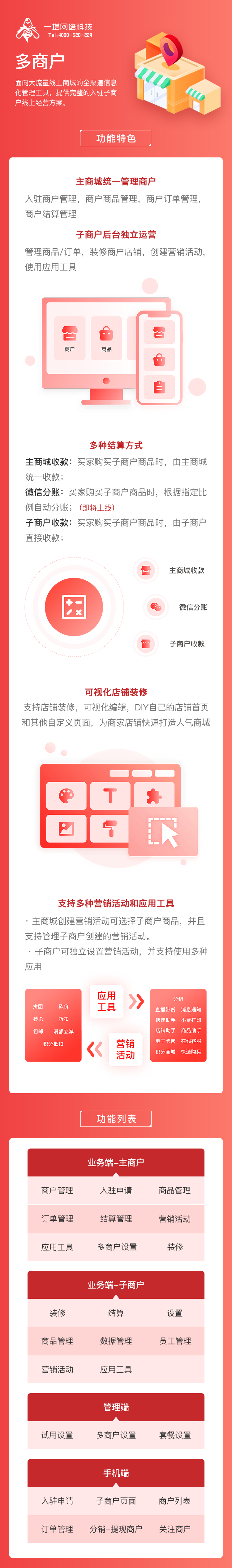 面向大流量线上商城的全渠道信息化管理工具,提供完整的入驻子商户线上经营方案。