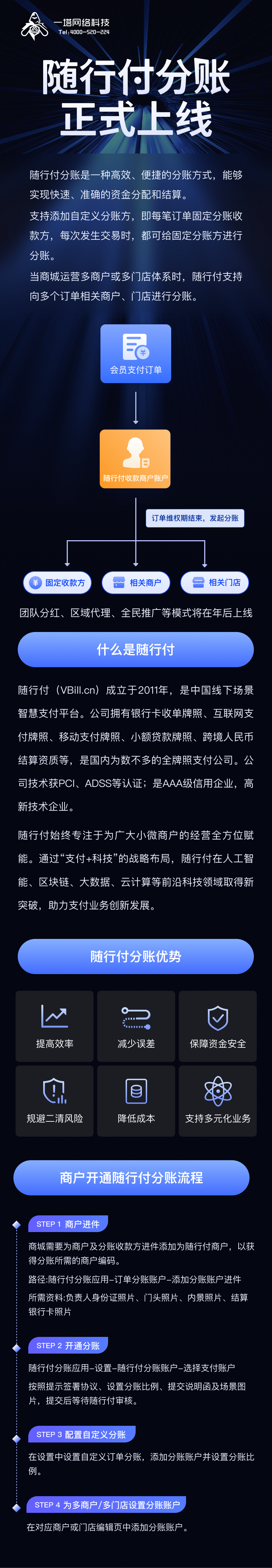 随行付分账是一种高效、便捷的分账方式,能够实现快速、准确的资金分配和结算。支持添加自定义分账方,即每笔订单固定分账收款方,每次发生交易时,都可给固定分账方进行分账。当商城运营多商户或多门店体系时,随行付支持向多个订单相关商户、门店进行分账。