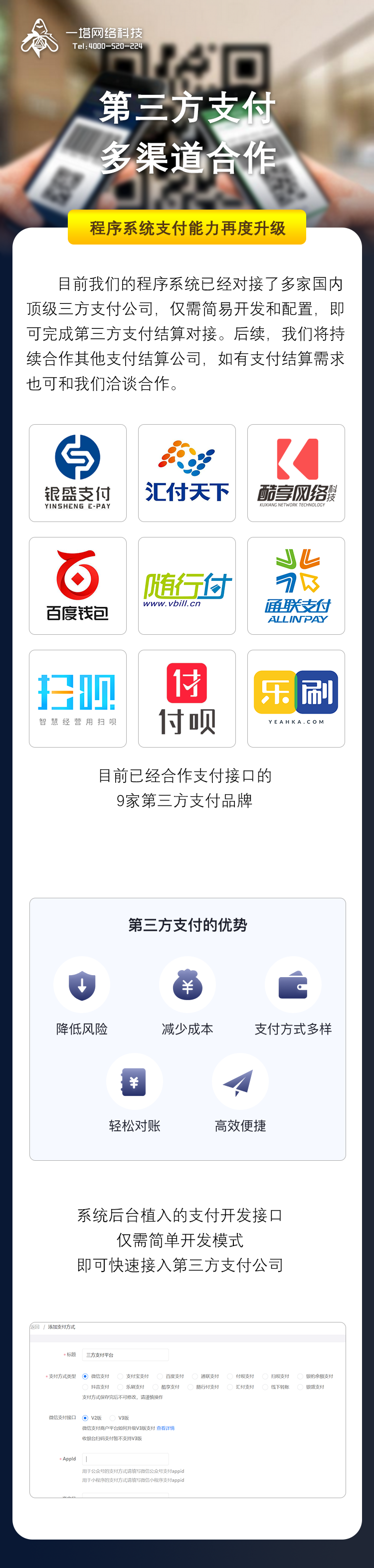 系统后台植入的支付开发接口,仅需简单开发模式即可快速接入第三方支付公司