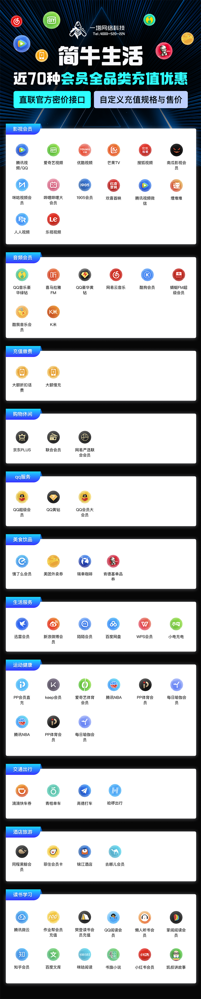 近70种会员全品类充值优惠,直连官方密价接口,自定充值规格与售价。