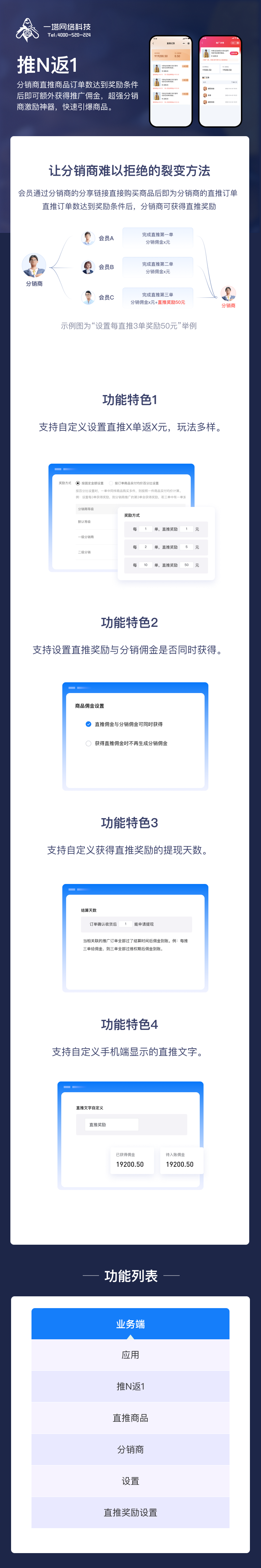 分销商直推商品订单数达到奖励条件后即可额外获得推广佣金,超强分销商激励神器,快速引爆商品。