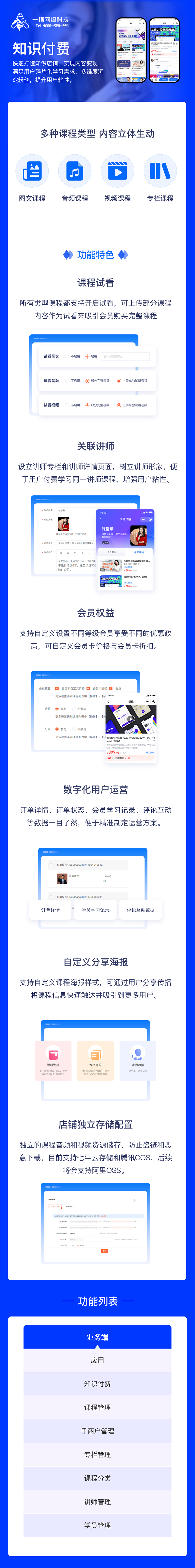 快速打造知识店铺,实现内容变现,满足用户碎片化学习需求,多维度沉淀粉丝,提升用户粘性。