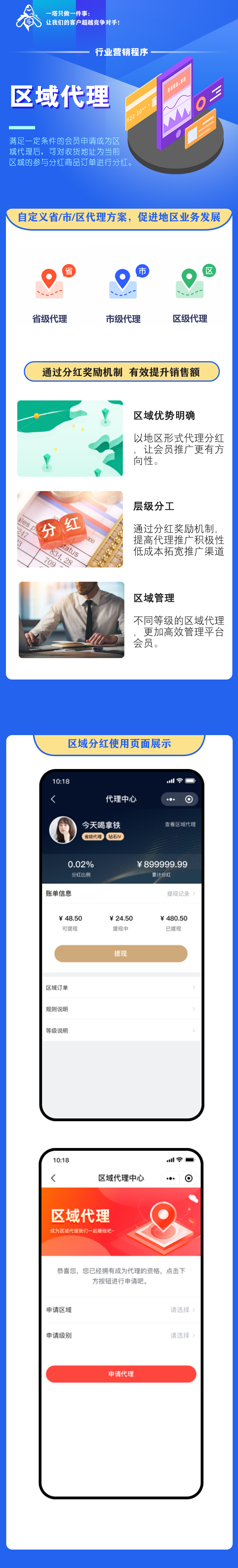 满足一定条件的会员申请成为区域代理后,可对收货地址为当前区域的参与分红商品订单进行分红。
